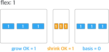 flex-grow 속성과 flex-shrink 속성, flex-basis 속성을 축약해서 flex 속성으로 표현할 때 flex: 1 속성은 flex: 1 1 0 속성을 의미한다. 즉, flex-grow 속성의 값이 '1'이고 flex-shrink 속성의 값이 '1'이기 때문에 flex container의 크기에 따라 flex item의 크기도 커지거나 작아진다는 의미다.