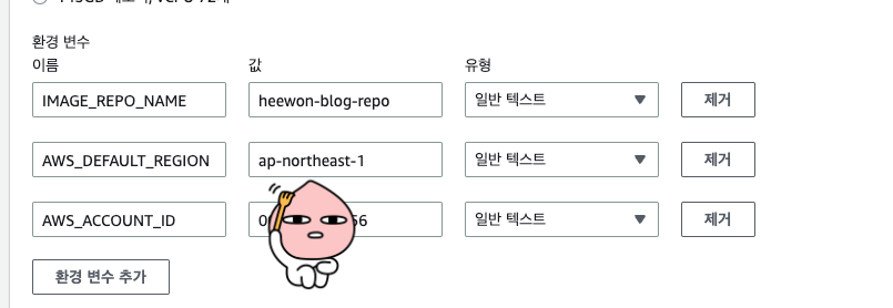 이 환경변수들은 추후에 buildspec.yml 파일에서 사용되어지는 친구들이다.
