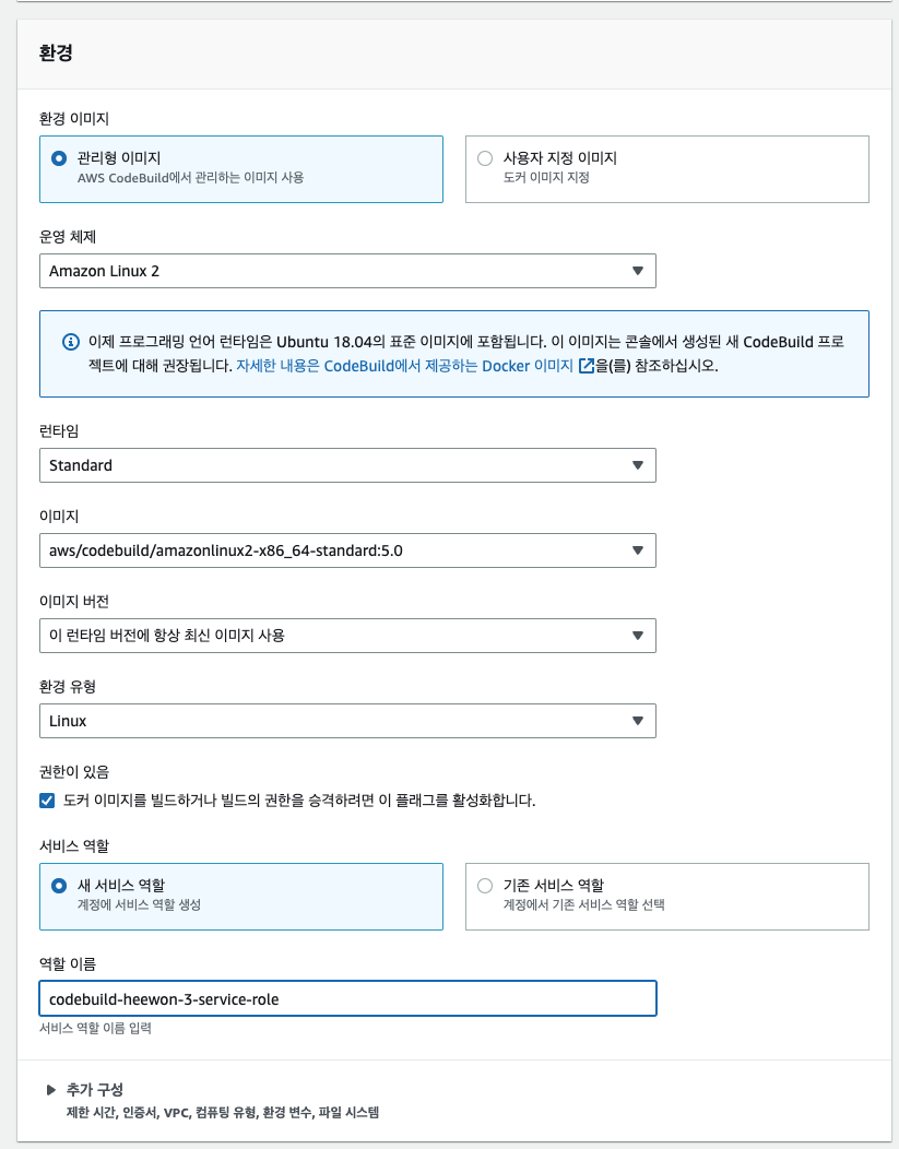 - 여긴 default의 값 그대로이다. buildspec파일을 이용하기 때문에 나는 이대로 선택해줬다.