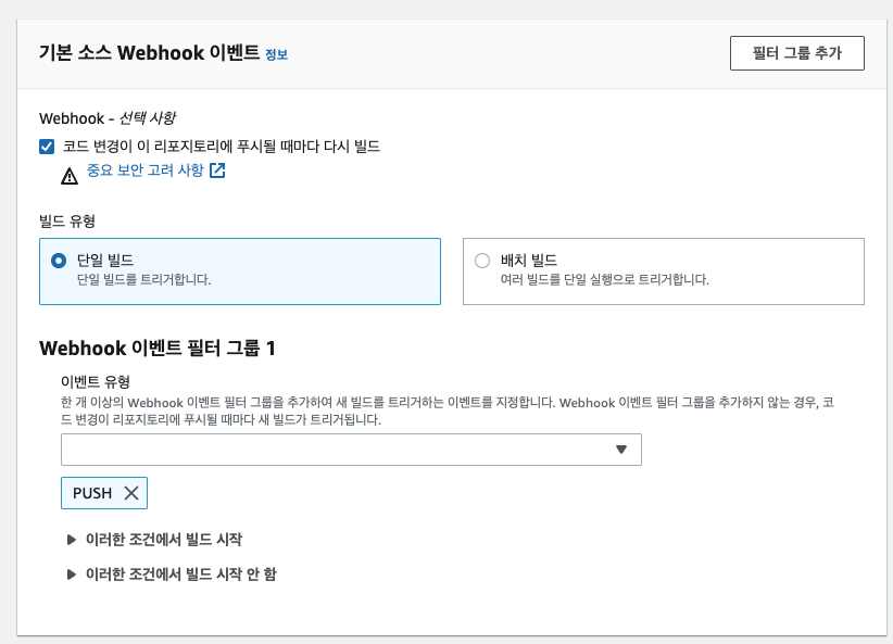 - 단, CodePipeLine에 따로 Webhook이벤트를 등록해서 CodeBuild를 연결시킬때는 이 CodeBuild 자체에서 등록한 Webhook은 삭제해야한다.