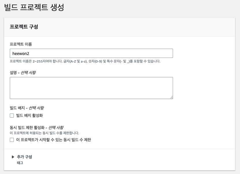 우선 CodeBuild의 설정부터 해보자. 되도록 미니멈하게 할 예정이라 안쓰는 옵션들이나 잘 모르겠는 옵션들은 일단 default 설정을 그대로 두었다.