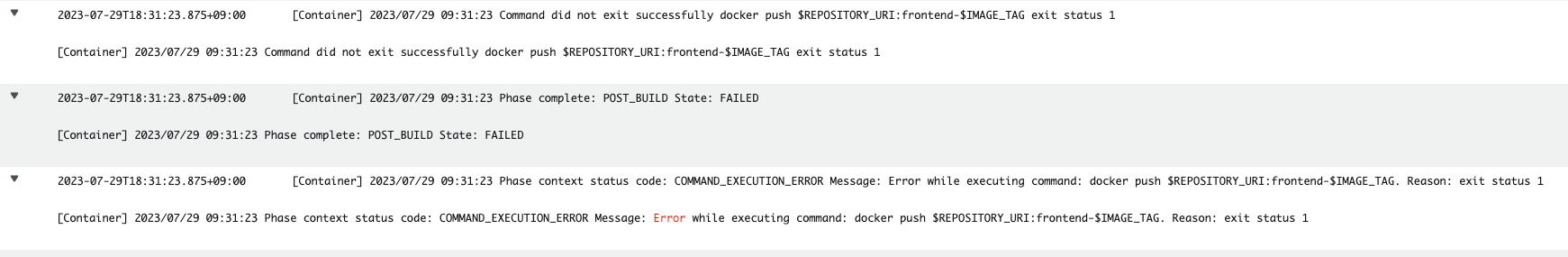 2. docker push하는 곳에서 그냥 error만 나고 딱히 원인은 적혀있지 않은 부분이었는데 이는 docker push를 할 수 있는 적절한 인증정보가 설정이 안되었을때 발생하는 에러일 가능성이 높다고 한다. 그래서 buildspec.yml에 docker login을 하게끔 스크립트를 추가해줬다.