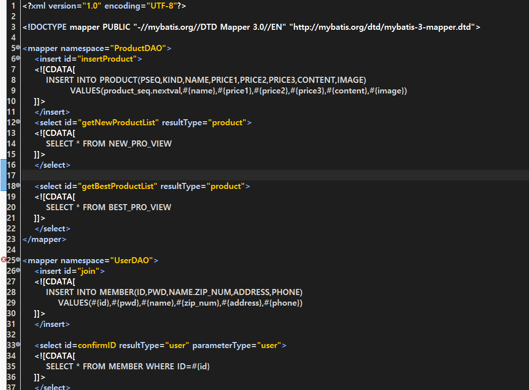 mapper 파일을 하나 만들어서 거기다가 DAO 별로 따로따로 ???_mapper.xml 만들어서 예쁘게 모아보아요~